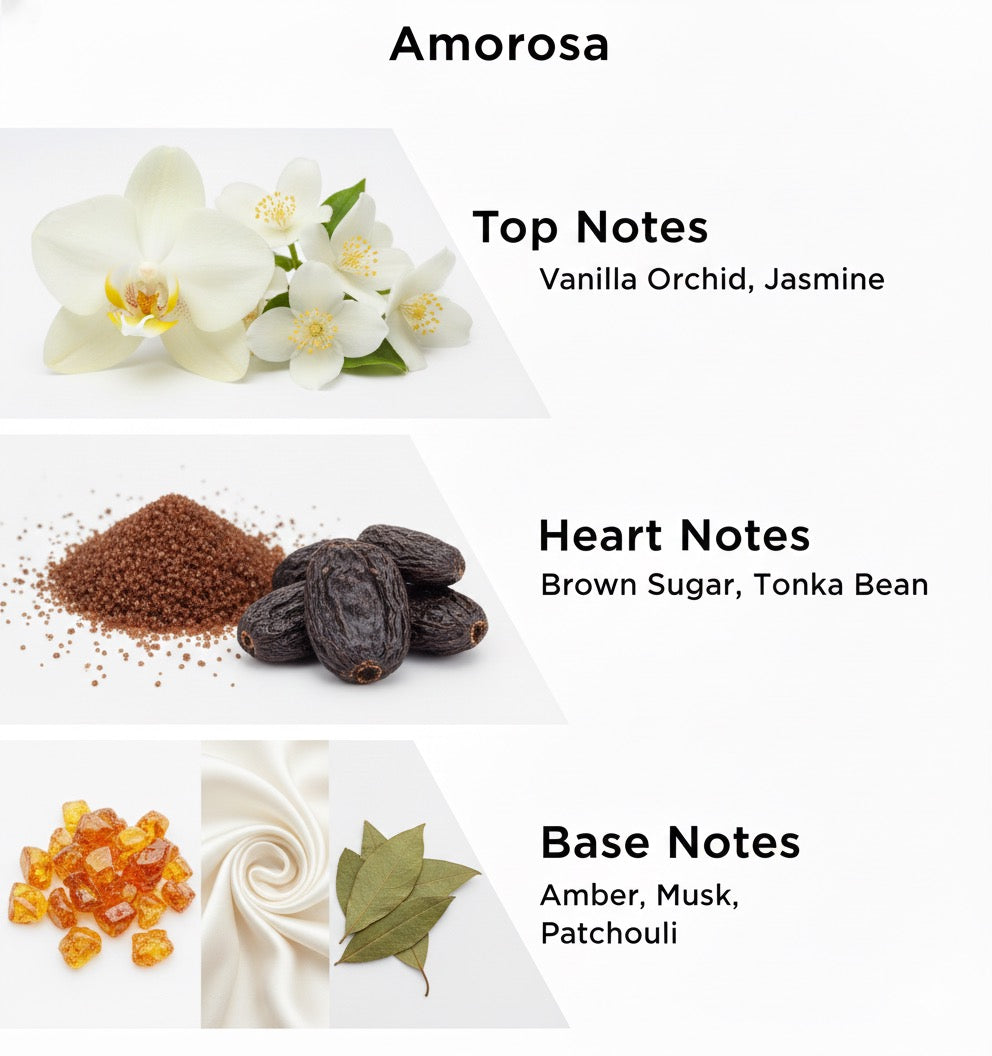 Amorosa is pure temptation in a bottle. The opening of vanilla orchid and jasmine draws you in with a delicate sweetness, while the heart of brown sugar and tonka bean adds a rich, addictive warmth. Finally, amber, musk, and patchouli create a deep, magnetic base that lingers with elegance and power. A fragrance for the woman who knows how to turn moments into memories.
