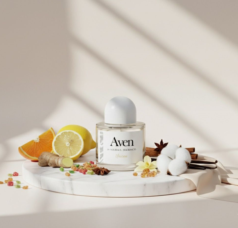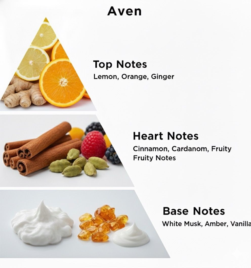 Aven starts with a lively mix of lemon, orange, and ginger for a clean and refreshing feel. The heart adds a fruity twist with green apple and melon, while soft spices make it cozy and unique. The warm base of musk, amber, and vanilla makes it last beautifully on the skin.