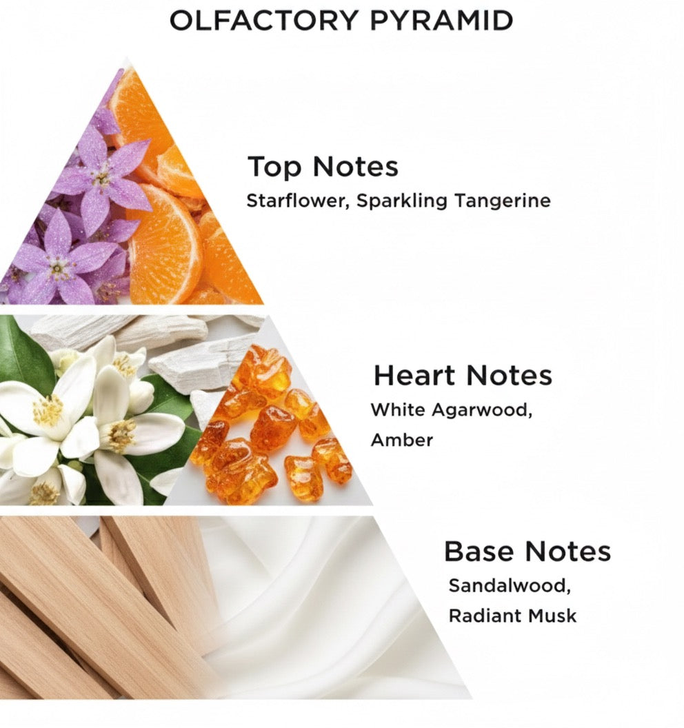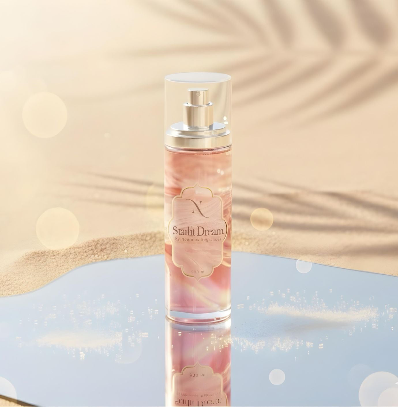 starlit dream is a luminous and sophisticated body splash that captures the magic of the night sky. It opens with bright tangerine and starflower, blending into soft amber and creamy vanilla. The touch of oud and sandalwood adds warmth and depth, leaving a luxurious scent that lasts. 200ml