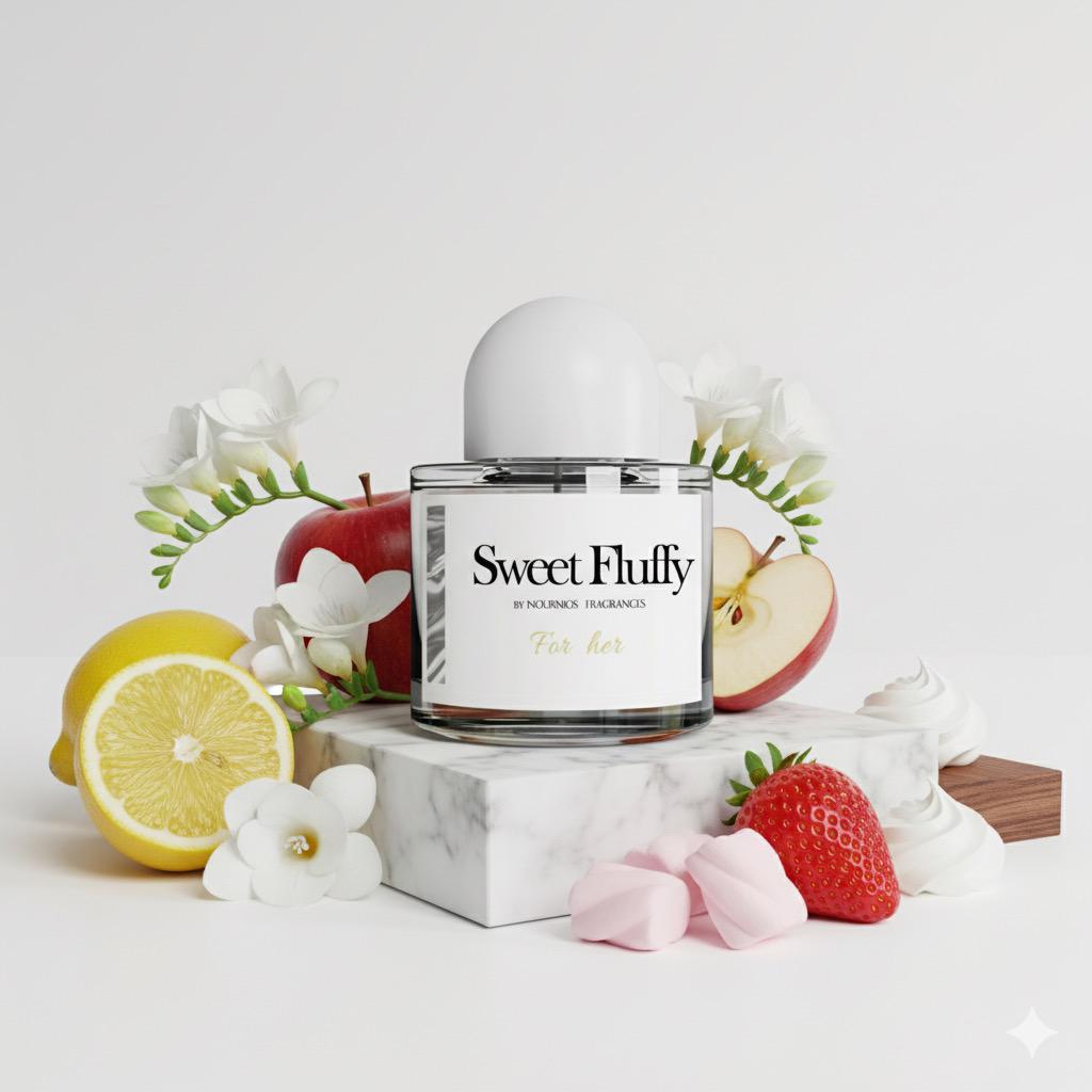 Sweet Fluffy is like a bite of happiness — crisp apple and fresh lemon meet delicate freesia and nectarine blossom. At its heart, fluffy pink marshmallow blends with juicy strawberry, creamy coconut, and a soft touch of orange blossom water. The base wraps it all in whipped vanilla, raspberry sugar, and pink musk, leaving behind a dreamy, candy-like trail. A fragrance that feels playful, girly, and absolutely unforgettable.