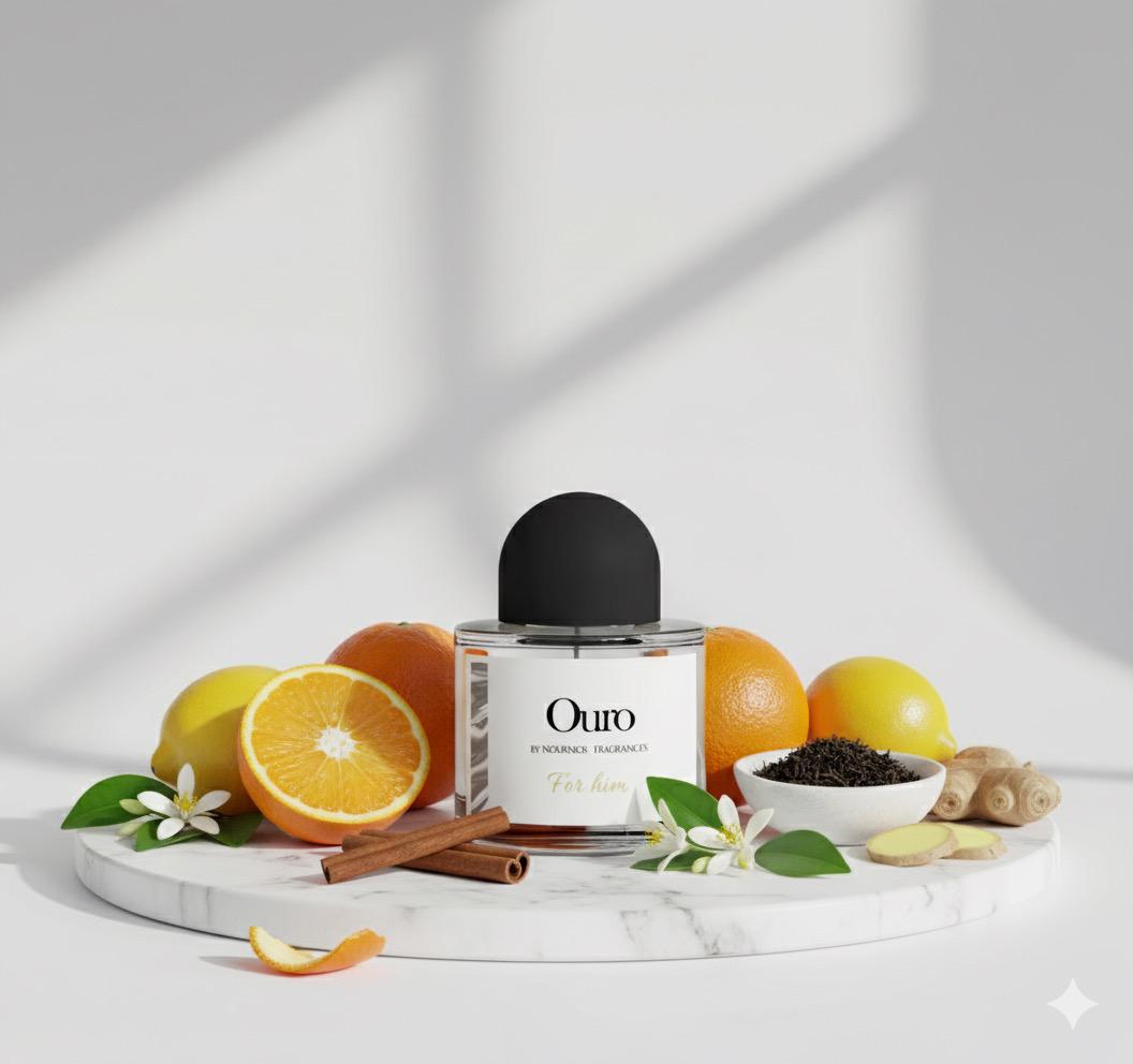 Ouro shines with a bright trio of citron, Sicilian orange, and Calabrian bergamot, giving it an energetic and refreshing start. The heart adds depth with neroli, ginger, and warm Ceylon cinnamon, before settling into a refined base of black tea, ambroxan, and olibanum. A fragrance that feels bold yet sophisticated — made for the man who moves with confidence and style.
